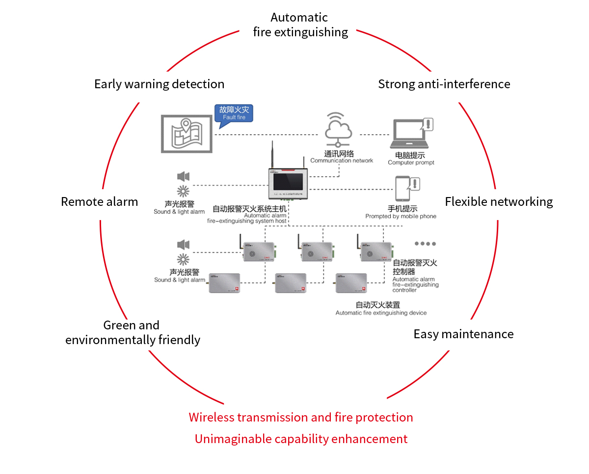 The system rapidly monitors the changes in the surrounding environment through the installation of distributed remote sensing module. Once the fire is detected, the system will quickly send an alarm signal through wireless communication to inform the location and the time of occurrence of the fire. It can automatically extinguish the fire while remotely informing the fire situation to ensure that the fire can be extinguished the first time.